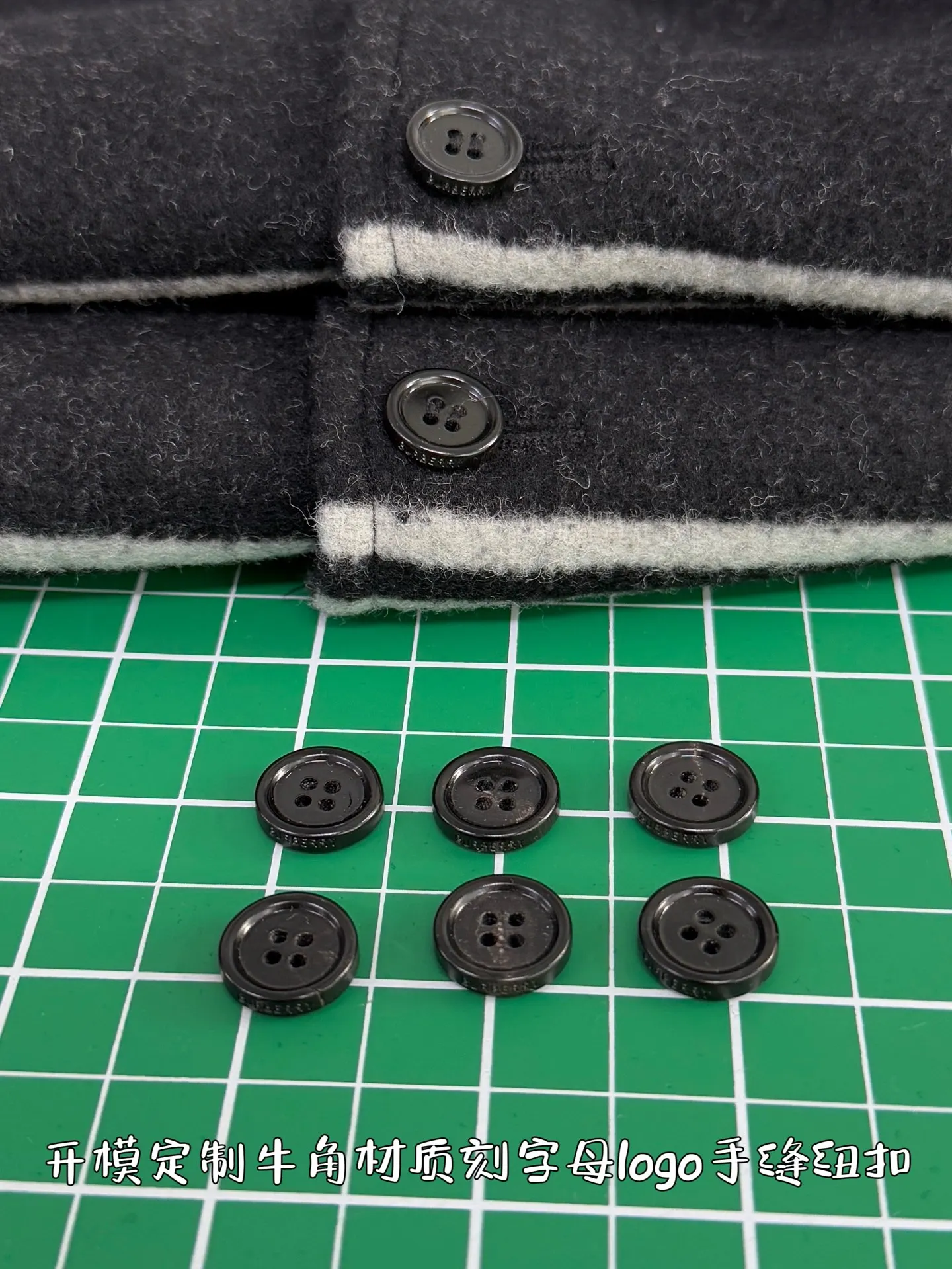 자카드 더블페이스 울 원단 스트라이프 소매 및 밑단 디테일 전면 버버리 기마문장 자카드 장식 플랩 포켓 및 소뿔 단추 로고 각인 단추 디테일